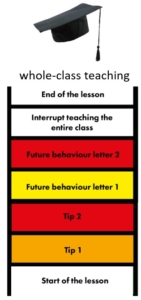- During whole-class teaching, the image turns red after the second ‘Tip’. The next pupil is asked to write a ‘Future Behaviour Letter’ printed on yellow paper; the following pupil is given a letter printed on orange paper. The colour indicates when the letter was issued during the lesson.