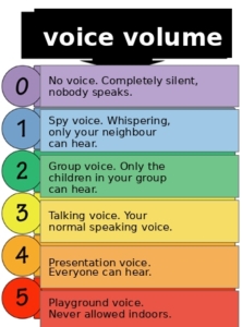 To guide the use of voice effectively, it is helpful to make clear agreements with the class. For this purpose FFT uses a voice-volume chart. This chart shows the different voice levels that can be used in the classroom and the volume expected. With a clip or magnet you indicate which voice level pupils should use at a particular moment.